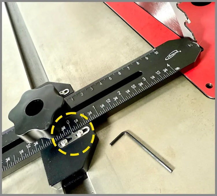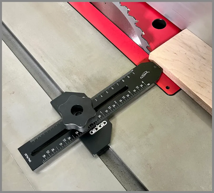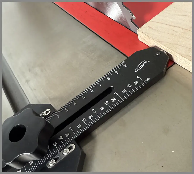 Easy to use, featuring a single robust grip knob that securely locks it into the miter track. Its scale, with 1/16 " and 1 mm graduations, enables precise adjustments. The roller bearing guide ensures your work piece stays firmly against the fence and serves as a stop for consistent, repeatable cuts. Simply cut a strip, reposition the saw fence to align the stock with the ball bearing, and then cut the next thin strip.